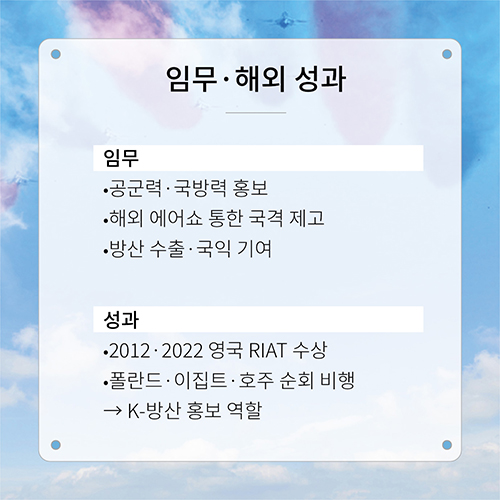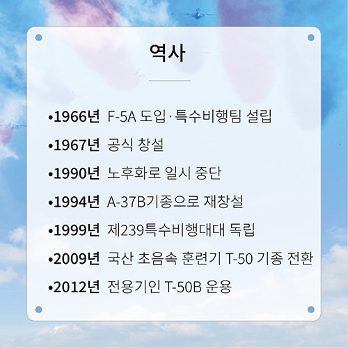´ëÇѹα¹ °ø±º Ư¼öºñÇàÆÀ ºí·¢À̱۽º´Â ±¹»ê ÃÊÀ½¼Ó Ç×°ø±â T-50B 8´ë·Î ±¸¼ºµÅ °íµµÀÇ ÆÀ¿öÅ©¸¦ ¹ÙÅÁÀ¸·Î ´Ù¾çÇÑ Æ¯¼öºñÇàÀ» ¼±º¸ÀδÙ. 1967³â â¼³ ÀÌÈÄ Àçâ¼³°ú ±âÁ¾ ÀüȯÀ» °ÅÄ¡¸ç ¹ßÀüÇØ¿ÔÀ¸¸ç, ÇöÀç´Â T-50B Àü¿ë±â¸¦ ¿î¿ë ÁßÀÌ´Ù. ÇØ¿Ü ¿¡¾î¼î Âü°¡¸¦ ÅëÇØ °ø±º·Â°ú ±¹¹æ·ÂÀ» ¾Ë¸®°í ±¹°Ý Á¦°í¿Í ¹æ»ê ¼öÃâ¿¡µµ ±â¿©Çϰí ÀÖ´Ù. 2012³â°ú 2022³â ¿µ±¹ RIAT ¿¡¾î¼î¿¡¼ ¼ö»óÇÏ¸ç ¼¼°èÀû ±â·®À» ÀÔÁõÇß´Ù.